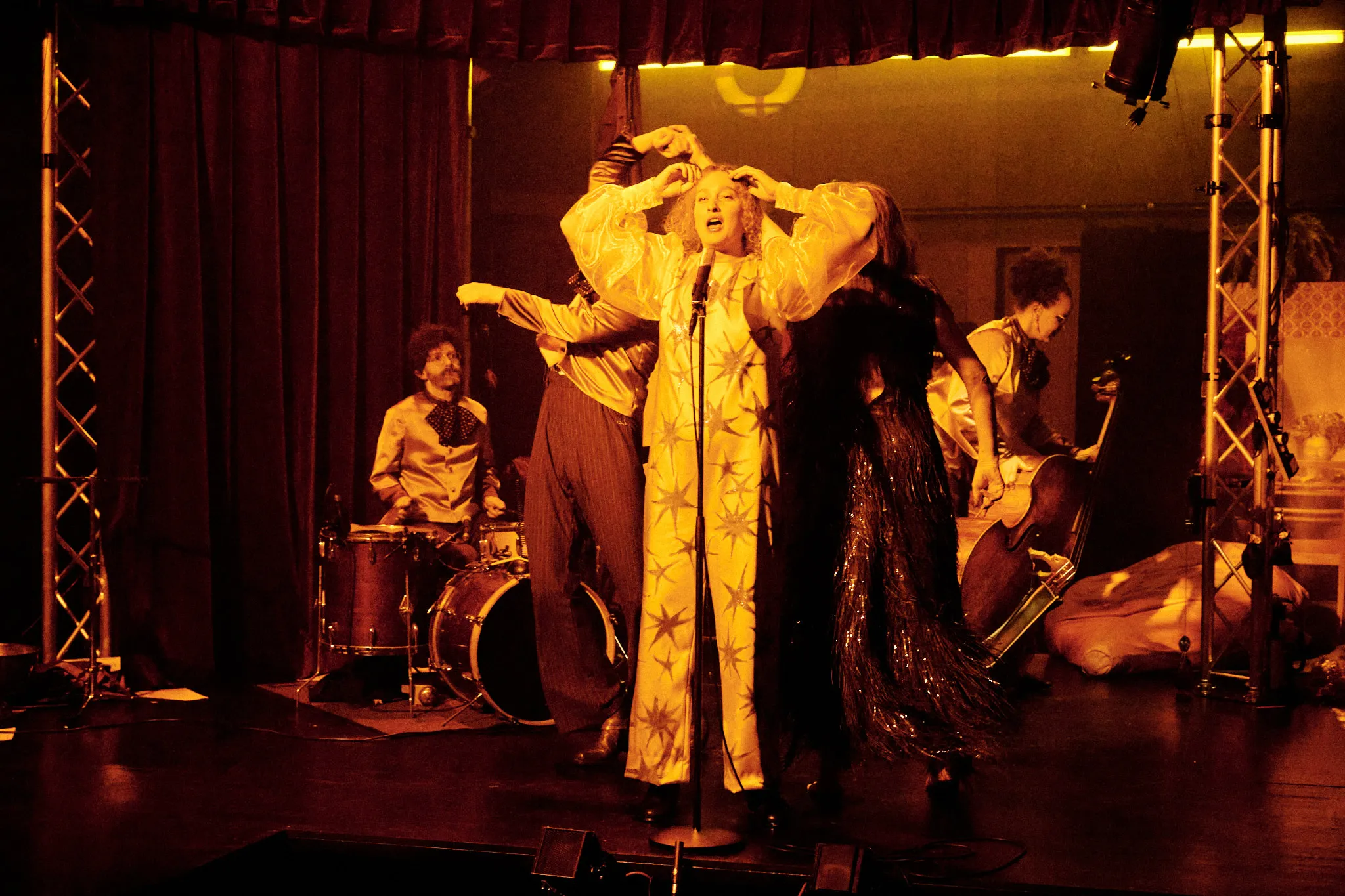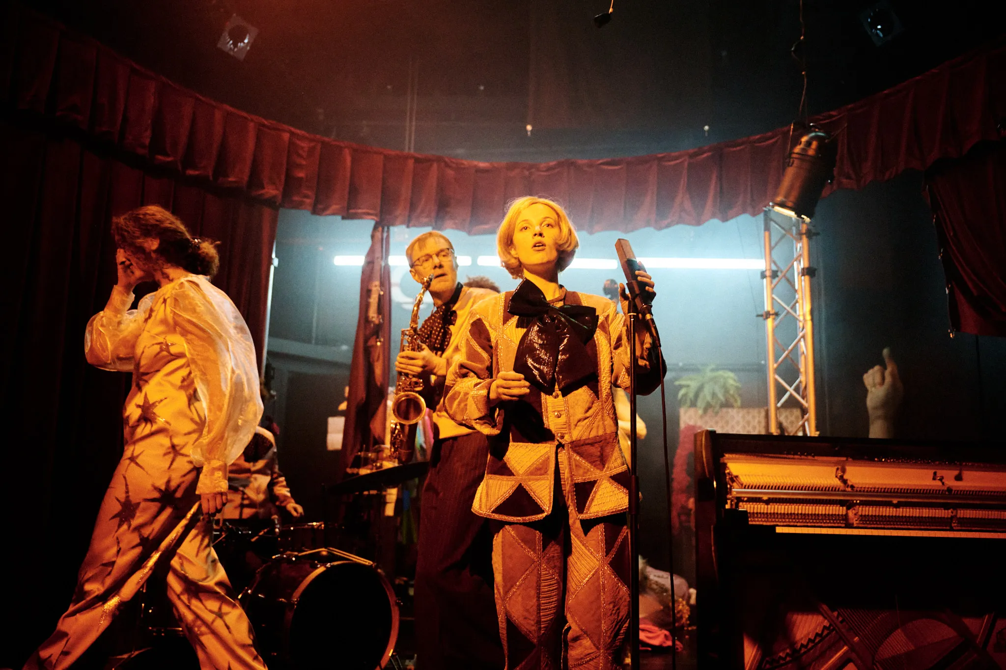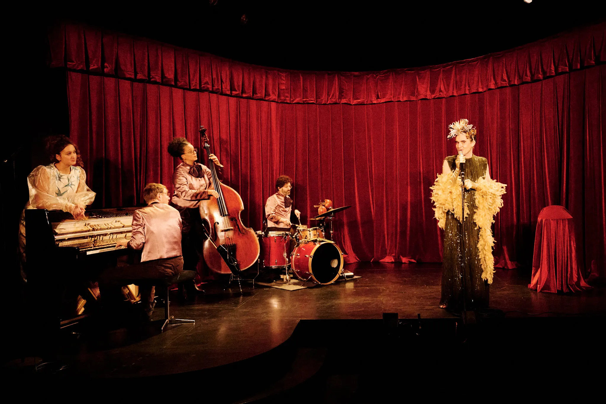Ce qui nous rassemble. Camille Rebetez, Rebecca Vaissermann, Daniel Vuataz et Fanny Wobmann ont écrit un texte à huit mains, une véritable partition de mots dont s’est ensuite emparé Antoine Courvoisier. Sous leurs plumes apparaissent les contours d’un cabaret, avec ses artistes et leurs personnalités colorées, ancré dans un futur proche dans lequel le monde que nous connaissons a disparu. Exit l’électricité illimitée et la connexion internet instantanée, envolée la profusion constante de nos sociétés, finie la nature verdoyante. L’environnement extérieur de cet avenir inquiétant est gris, enfoui sous les cendres d’un temps révolu. Dans cet espace scénique aux allures de refuge se déploie alors un petit monde clos bousculé par l’urgence, et les numéros s’y enchaînent dans un foisonnement vertigineux de chansons et de danses.